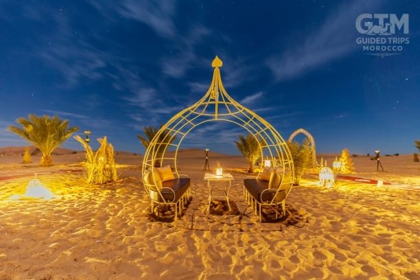 Following a brief stop in Zaida or Midelt for lunch and rest, we’ll continue to the Ziz Valley, a desert region known for its picturesque palm trees and stunning natural features. Once in the Sahara Desert, take a camel ride across the golden dunes of Erg Chebbi in Merzouga. Afterwards, you’ll have the opportunity to witness a spectacular desert sunset. end the day with an overnight stay at a wonderful luxury desert camp.